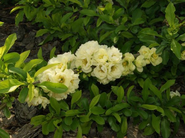 - Kdoule Yukigoten je hustý ker s krémovo bielymi, dvojitými kvetmi;