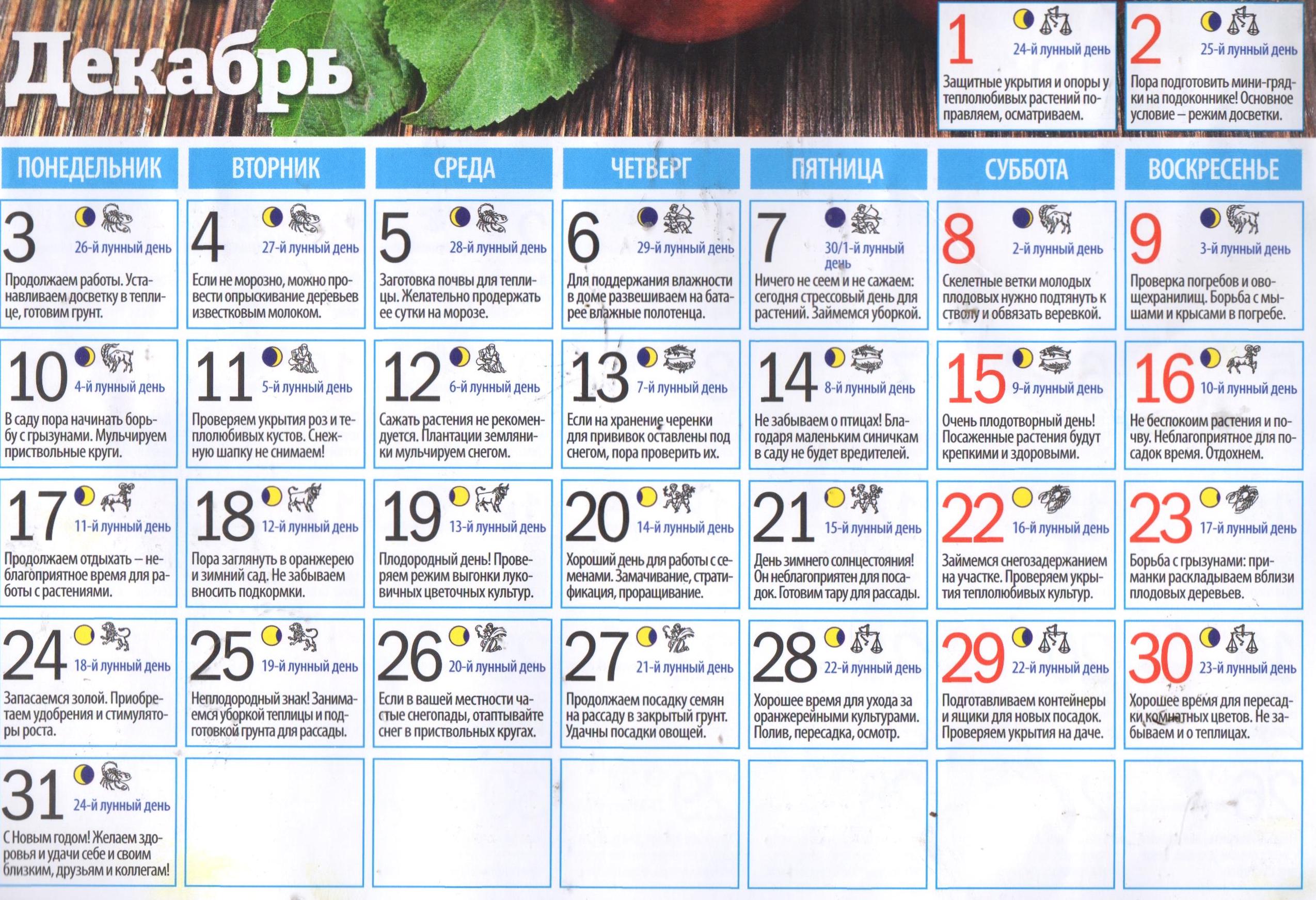 Podľa lunárneho kalendára pripadá fáza ubúdajúceho mesiaca medzi 1. a 6. decembrom. Toto je čas na zakorenenie cibuľovitých rastlín. Izbové rastliny sa môžu bezpečne polievať a hnojiť. 7. decembra je nový mesiac, takže si záhradníci aj rastliny môžu oddýchnuť. Počas prvých dní izolujte pivnice určené na skladovanie úrody.