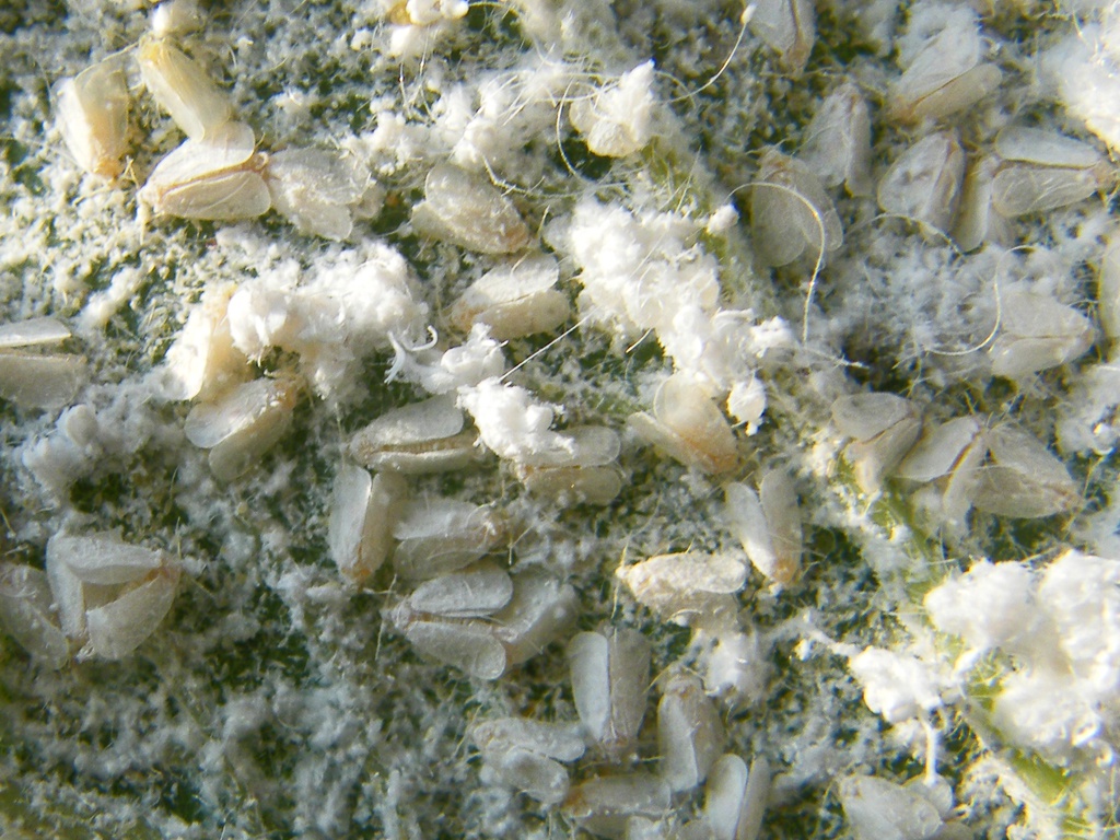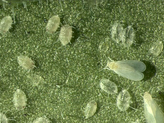 - Na spodnej strane listovej čepele sa nachádza veľké zhluky škodcov. Ak ich vyrušíte, odletia. Nájdenie lariev na rastlinách je oveľa ťažšie ako nájdenie dospelých jedincov. Je to preto, že pripomínajú šupiny a majú žltkasto-priehľadnú farbu. Môžu sa nachádzať aj na spodnej strane listu.