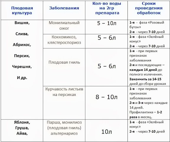 Dávkovanie prípravku je 2 g na 10 litrov vody. Postrek sa vykonáva podľa nasledujúcich pravidiel: