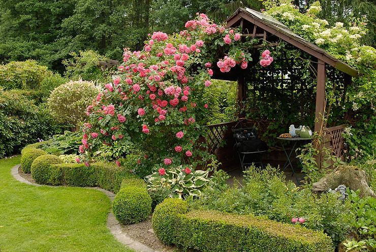 „Juh je bohatý na rôzne kvitnúce rastliny, ale popínavá ruža Rosarium Uetersen si zaslúži osobitnú pozornosť. V našej záhrade rastie už mnoho rokov. Pri správnej starostlivosti vždy bohato kvitne.“