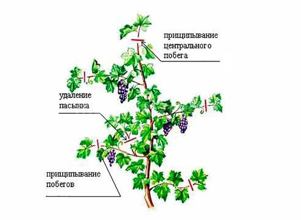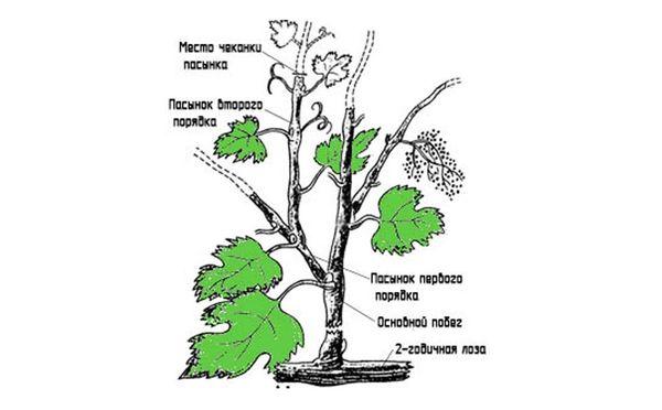 Bočné výhonky na akomkoľvek viniči sa odstraňujú po vytvorení prvého listu na sekundárnych vetvách. Niekoľko spodných listov by sa malo ponechať, ale koruna stonky a horné listy by sa mali odstrániť. Bočné výhonky by sa mali odstrániť hneď, ako sa objavia.