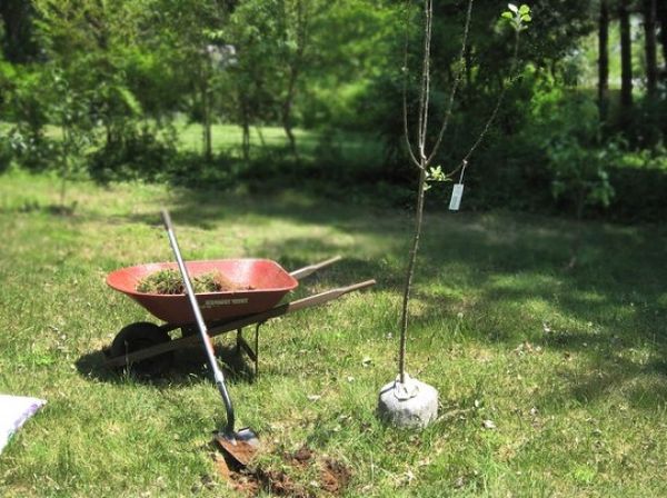 Do pripravenej jamy pridajte trochu čiernej zeminy: pomôže to predísť popáleniu koreňov spôsobenému príliš veľkým množstvom hnojiva. Keď sadenicu umiestnite do jamy, priviažte ju k výsadbovému kolíku. Korene naplňte zeminou, aby ste vyplnili všetky medzery, inak môže rastlina časom vyschnúť.